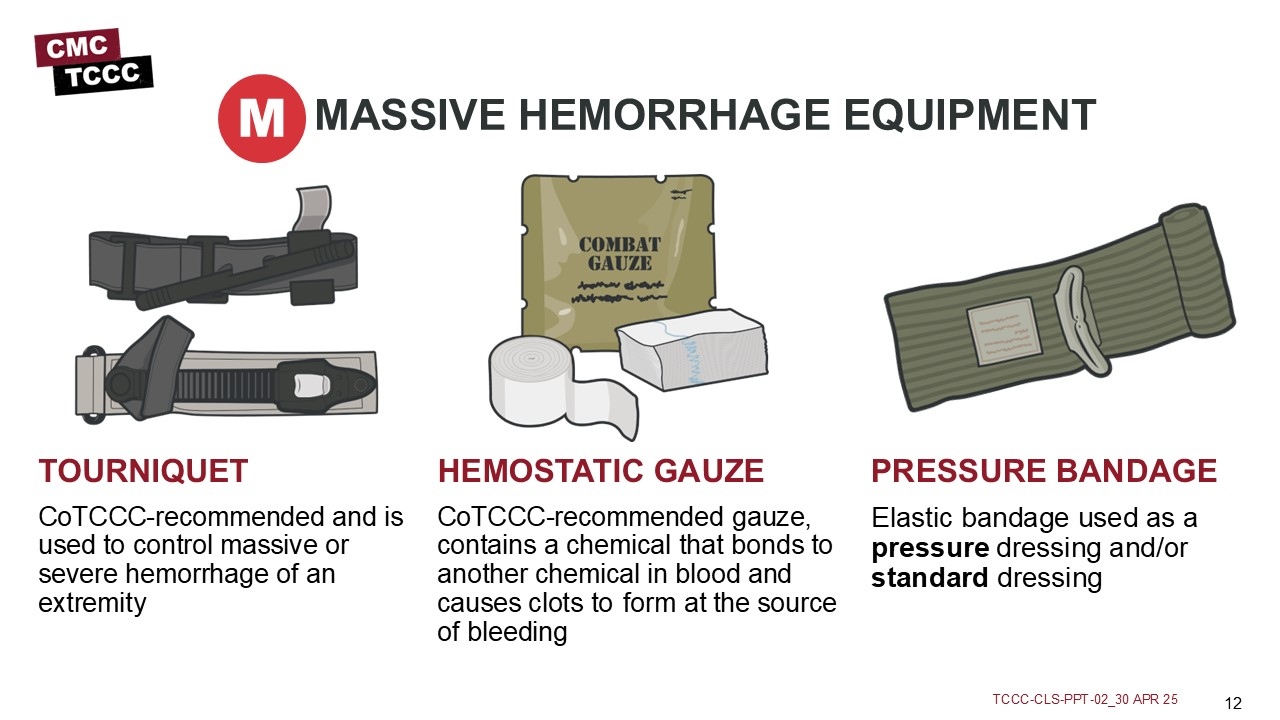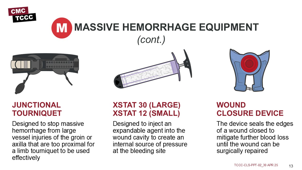 Throughout this course, you will be learning about the details of most of this equipment. Identifying which items have CoTCCC-approved options, specific information about the actual materials, and describing how they are used is part of each course module. But an introduction to key equipment items might help set the stage.