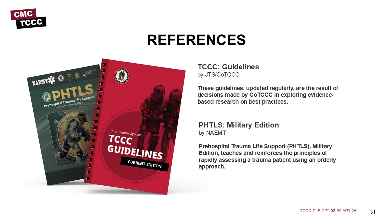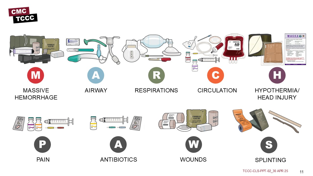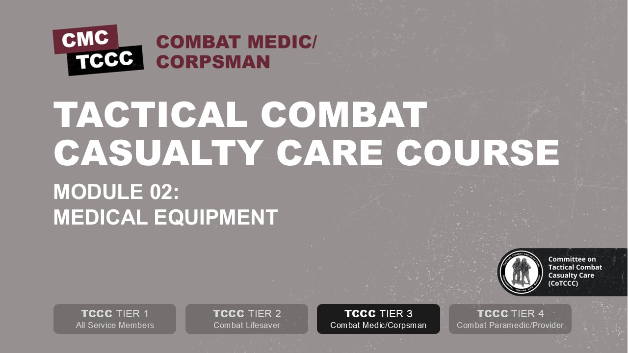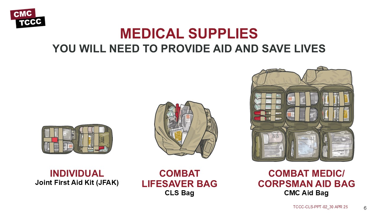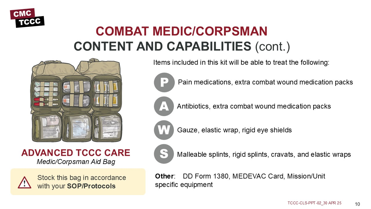 This lesson provides an opportunity to get a hands-on introduction to the kits and their contents. The equipment discussed supports the provision of TCCC per the current guidelines and enables the All Service Member, Combat Lifesaver, or Combat Medic/Corpsmen to address issues identified in Care Under Fire, Tactical Field Care, and TACEVAC Care using the MARCH PAWS approach.