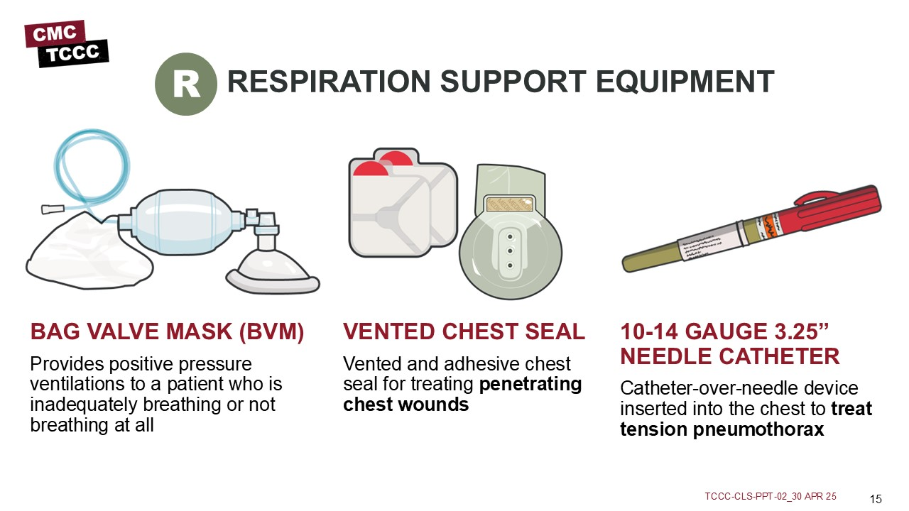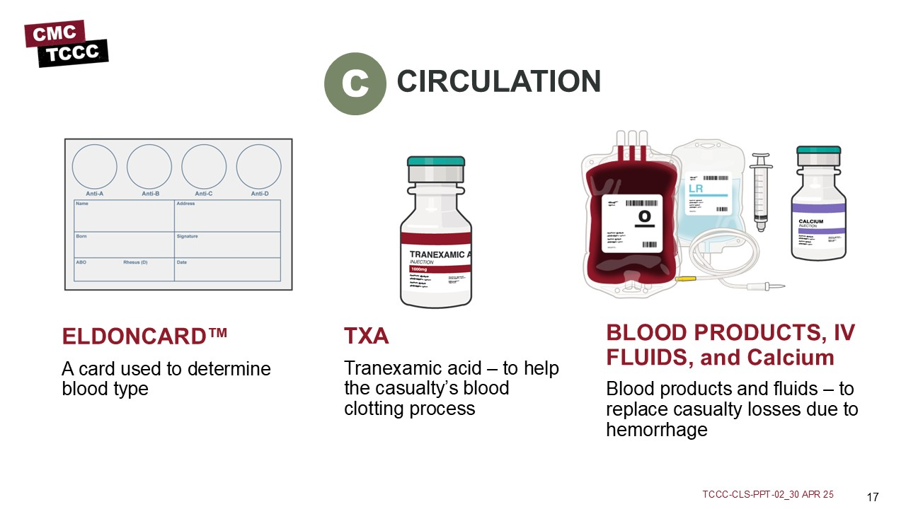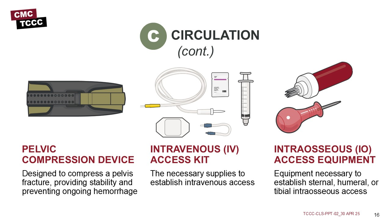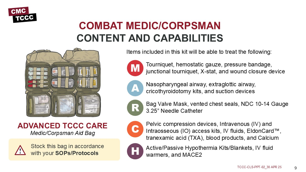 For example, the CMC aid bag contains junctional tourniquets for massive hemorrhage control, advance airways and cricothyroidotomy kits for airway management, and intravenous and intraosseous access supplies, IV fluids, blood products, and medications to address circulation issues and shock, to name a few.