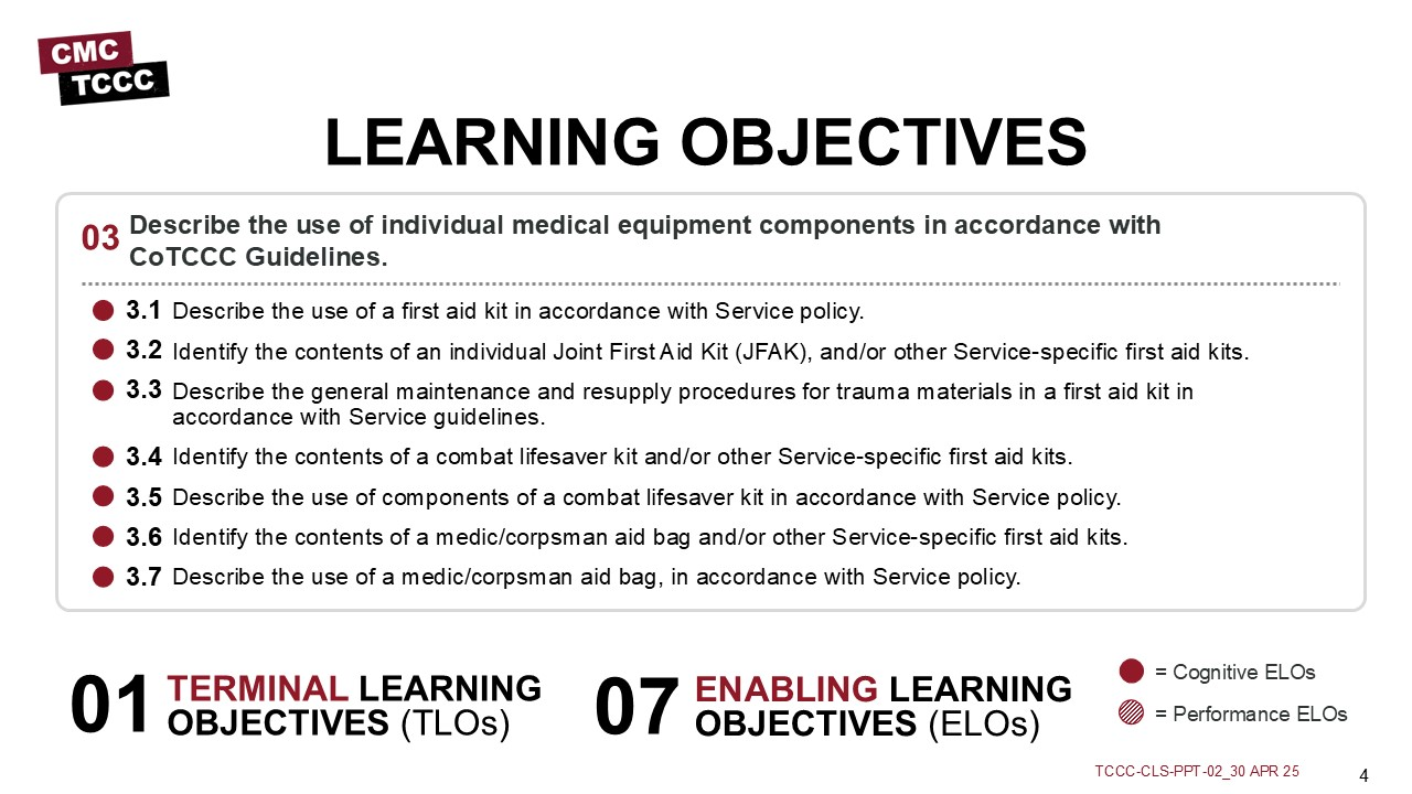 During this module, we'll talk about medical equipment use during Tactical Combat Casualty Care. There are seven learning objectives starting with understanding how first aid kits are used in accordance with Service policy. In addition to identifying the contents of the individual Joint First Aid Kit (JFAK), combat lifesaver kits, and medic or corpsman aid bags, we’ll go over the use of those kits and the general maintenance and resupply procedures as defined by the Services.