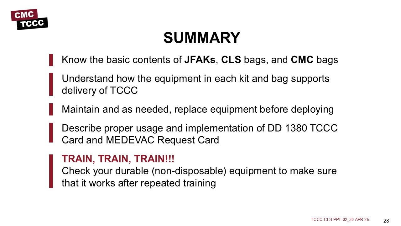 You should now be able to identify the basic equipment usually found in individual kits, or JFAKs, Combat Lifesaver kits, and Combat Medic/Corpsman bags, understanding that the needs of the medic/corpsman can vary from person to person. Likewise, you should be able to describe how the various kits support TCCC delivery following the MARCH PAWS treatment approach.