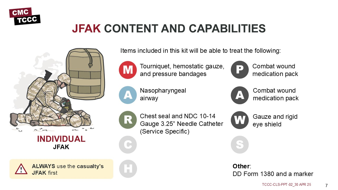 Every piece of equipment chosen for the JFAK is evidence-based (based on lessons from years of war in Iraq and Afghanistan) and serves a distinct purpose for the individual Service member; knowing how to properly use what is in the JFAK can save a life.