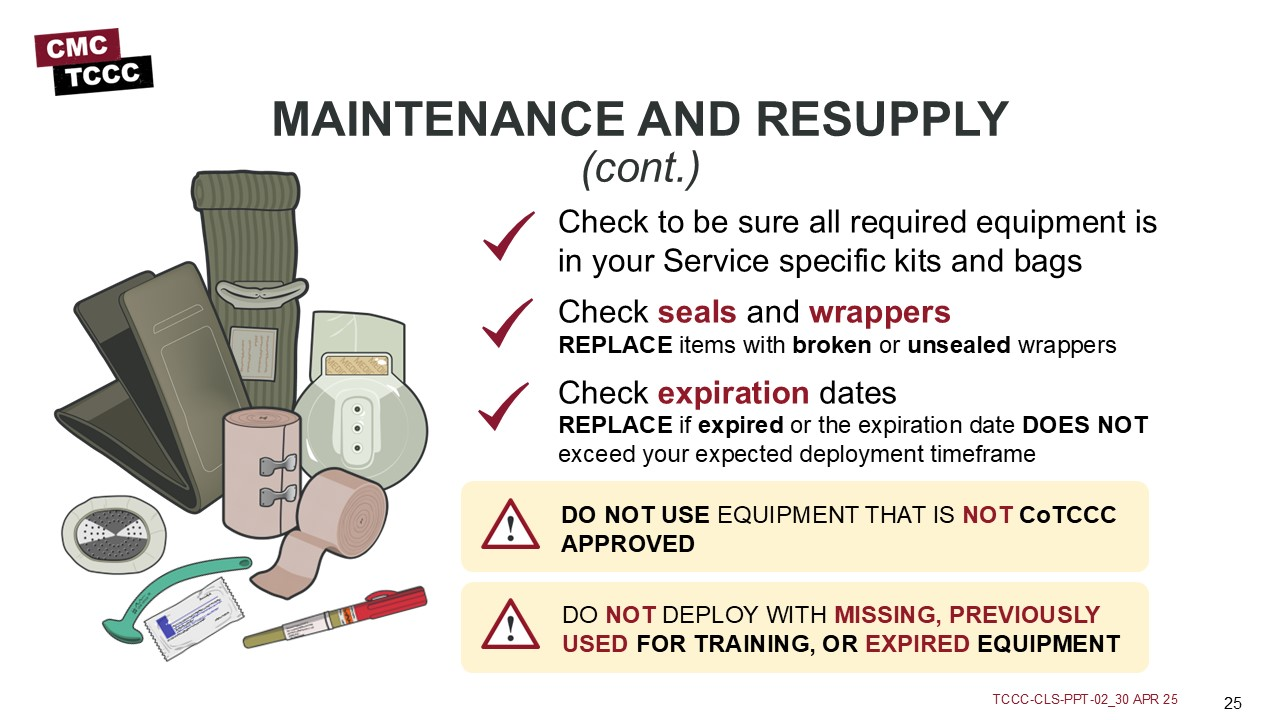 Medications and many medical-grade materials such as hemostatic dressings have an expiration date and lot number. Check all medications and medical-grade items for expiration date and replace if expired or the expiration date does not exceed your expected deployment timeframe. Generally, items such as tourniquets do not have an expiration date, but check to ensure the devices are approved by the DoD Committee on Tactical Combat Casualty Care, are serviceable, and reflect the current generation (have not been replaced with a newer model, etc.).