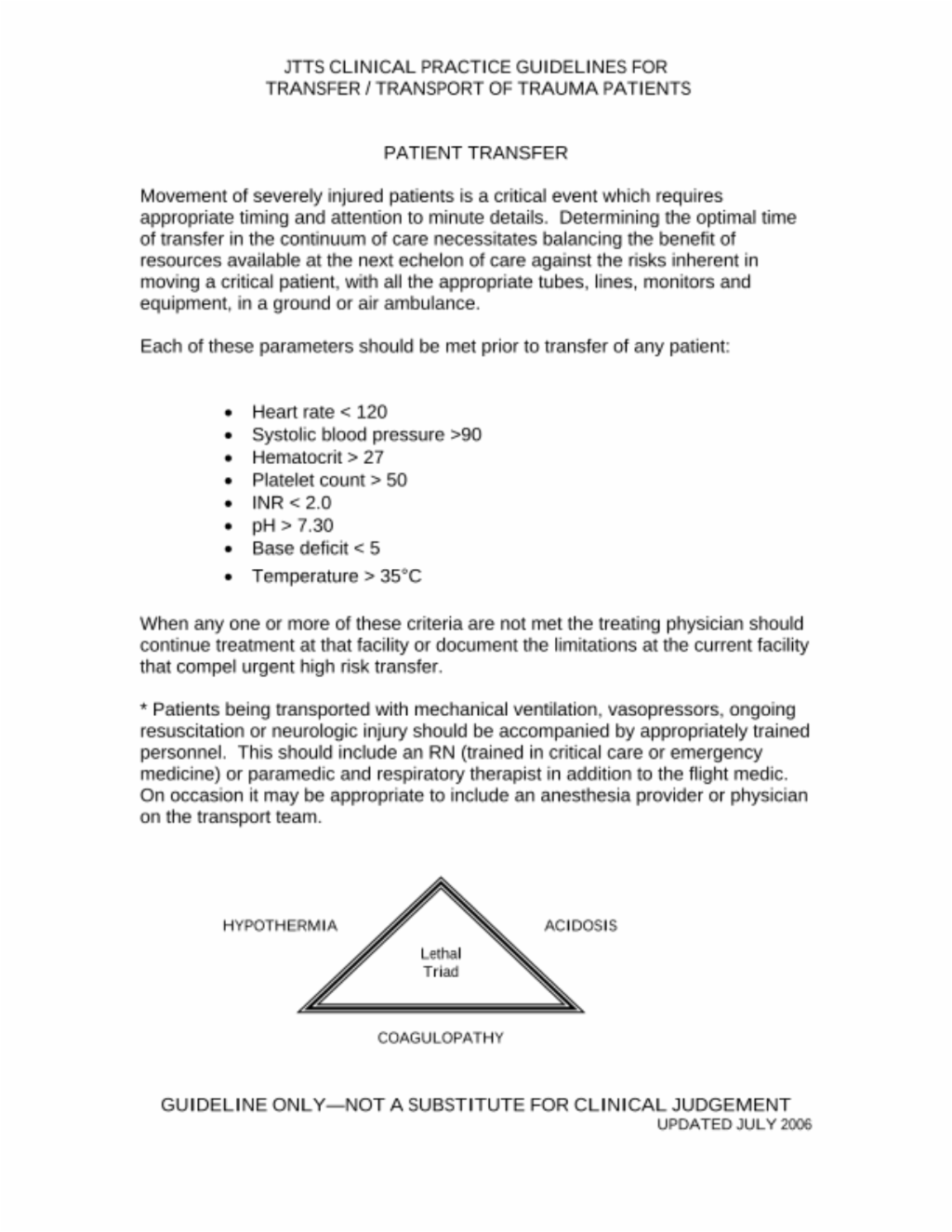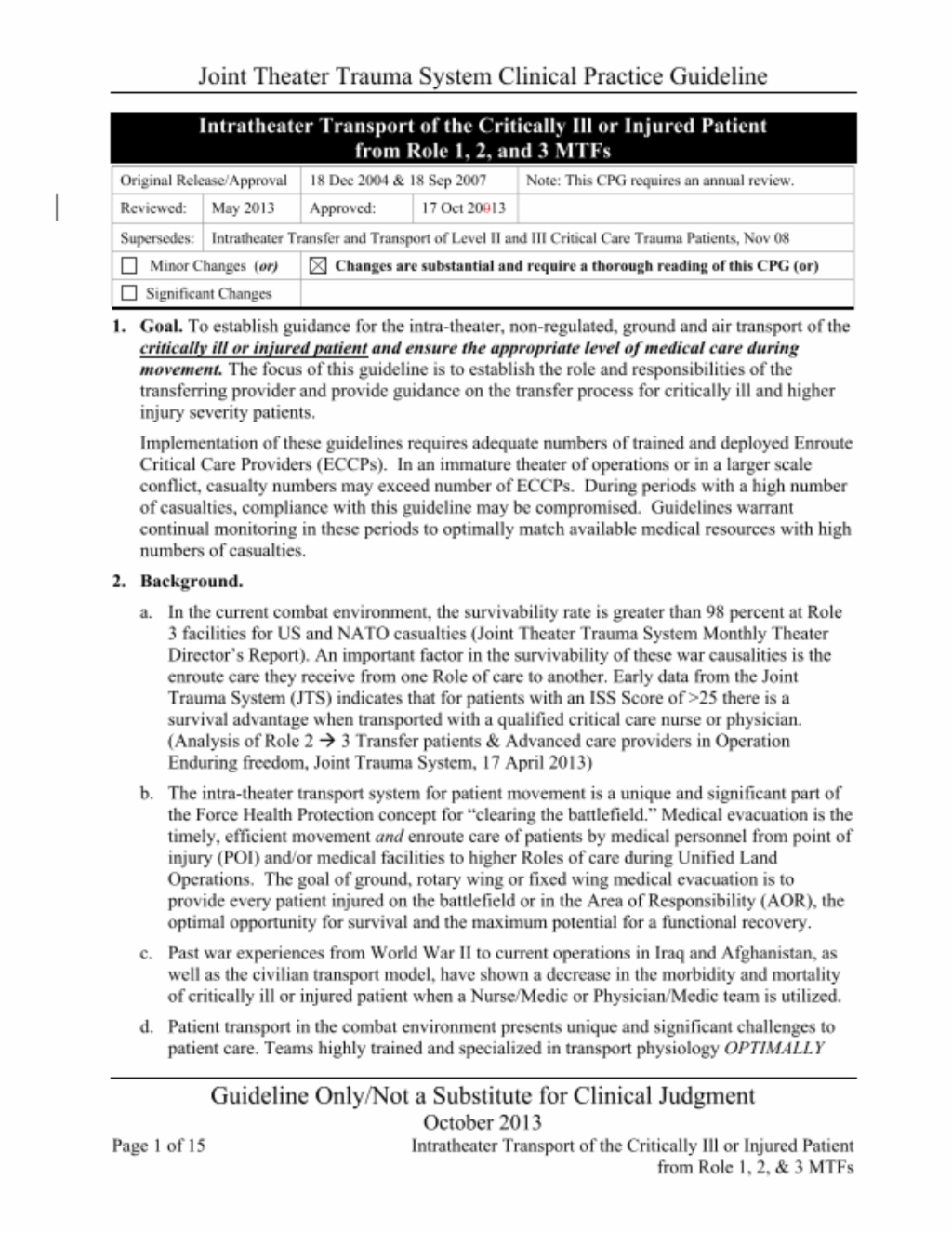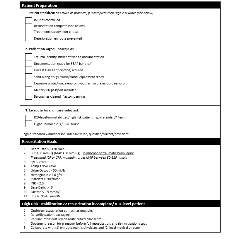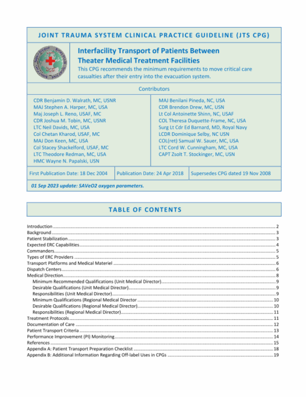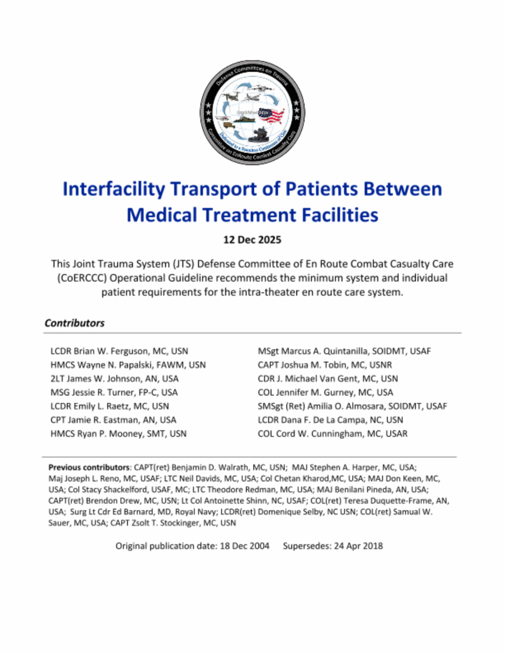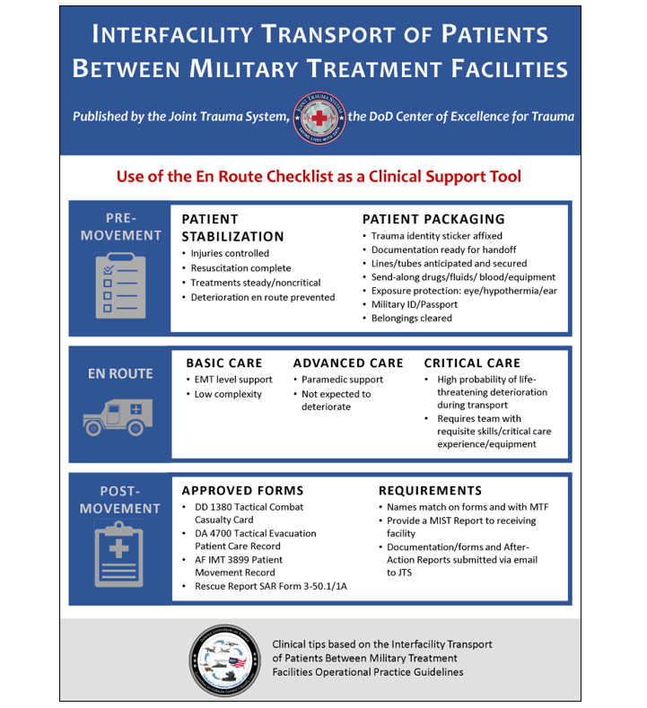 This JTS Operational Guideline recommends the minimum requirements and capabilities for the movement of critical care patients between military medical treatment facilities (MTFs). ERC and patient movement play a critical role in the combat casualty care continuum. Short times to a ‘capability’ allow for life-saving intervention to be delivered shortly after illness or injury; this was the trauma system during previous U.S. Central Command (USCENTCOM) operations. Rapid transport through the care continuum was exploited during USCENTCOM operations to support the small medical footprint, forward surgical care, and rapid transport to a higher echelon of clinical care. This was made possible secondary to air superiority and numerous deployed Medical Evacuation (MEDEVAC) teams. In the future operating environment, ERC personnel may find themselves providing primary and emergent care with little possibility of timely patient movement. All providers should have familiarity with the risks, benefits, and alternatives to rapid movement of casualties and have a clear understanding and familiarity with all possible platforms in which they could be called upon to move patients in theater to the next role of care.