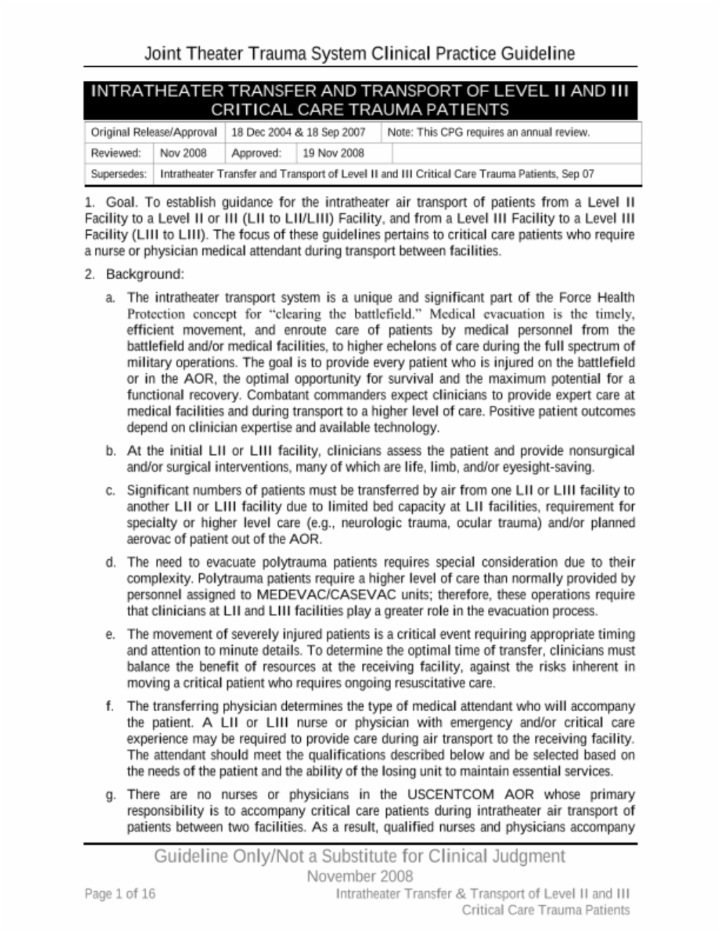 This guideline is specifically concerned with the administrative aspects of inter-facility transport of patients between the intra-theater roles of care. Please refer to the En Route Care guidelines (located on JTS website & Deployed Medicine) and to Aeromedical Evacuation (AE) guidelines for inter-theater transport. It is important to note that, in an immature theater of operations or in a larger-scale conflict, casualty numbers may exceed available resources. When this occurs, compliance with this guideline may be compromised.