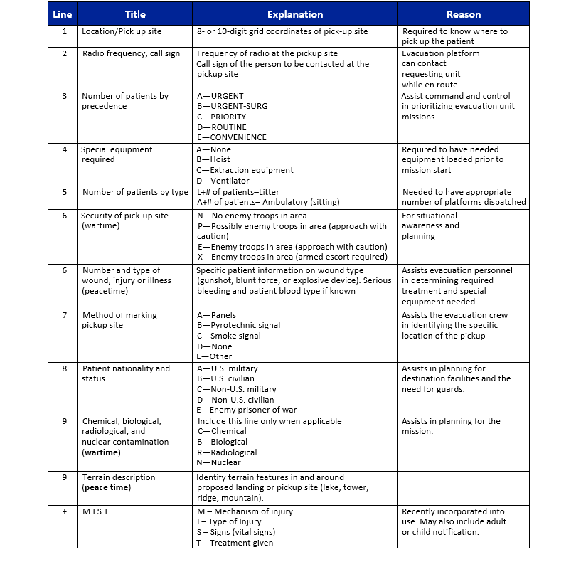 9-Line MEDEVAC Requests can be used to request transfers between the Roles of Care but will require more clinical information to support the planning and coordination required to meet the needs of the patient and validate the level of ERC required to safely move high acuity patients, maintain clinical stability, and manage ongoing complex physiological needs in a dynamic transport environment. See Appendix A for the NATO 9-line MEDEVAC Request.