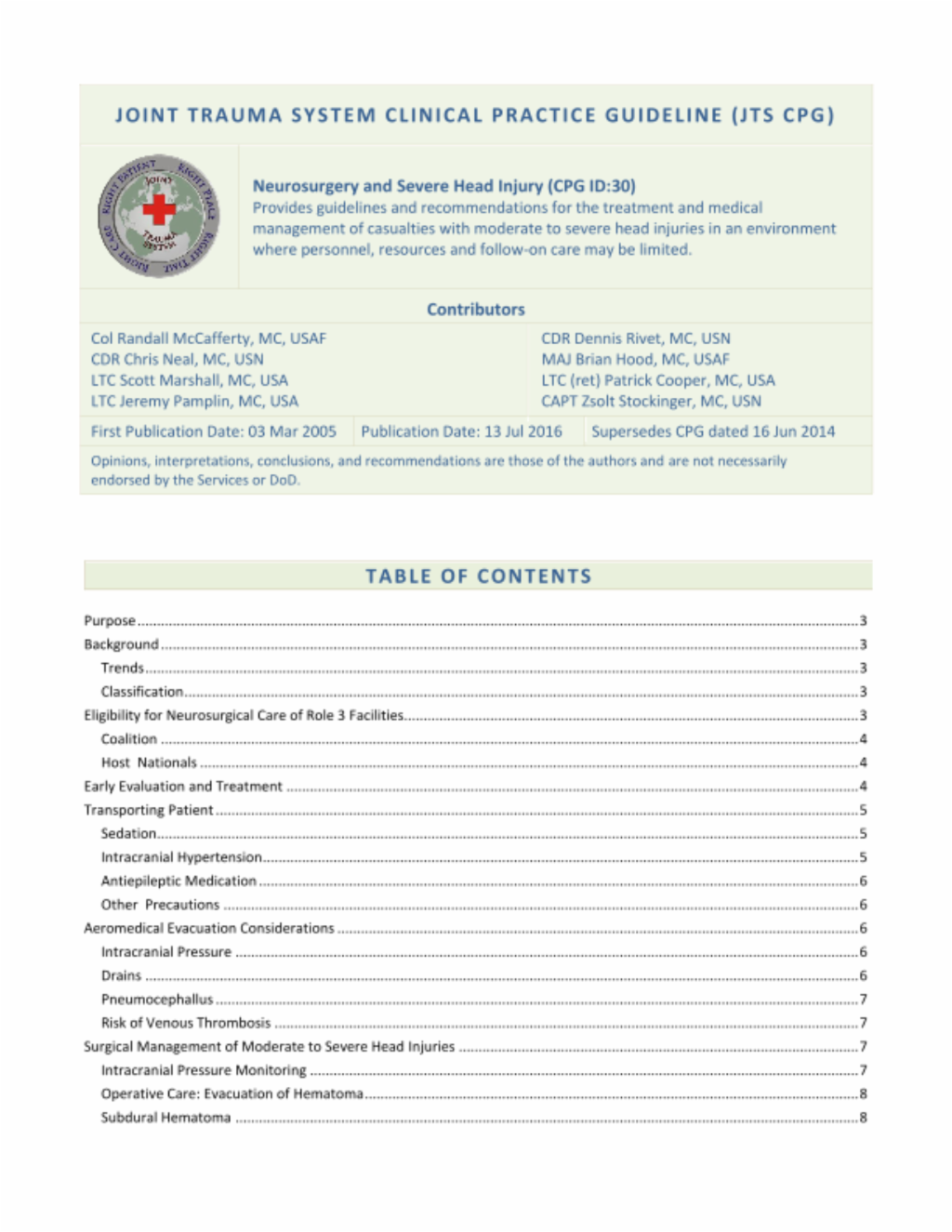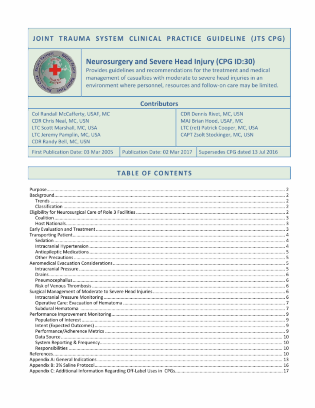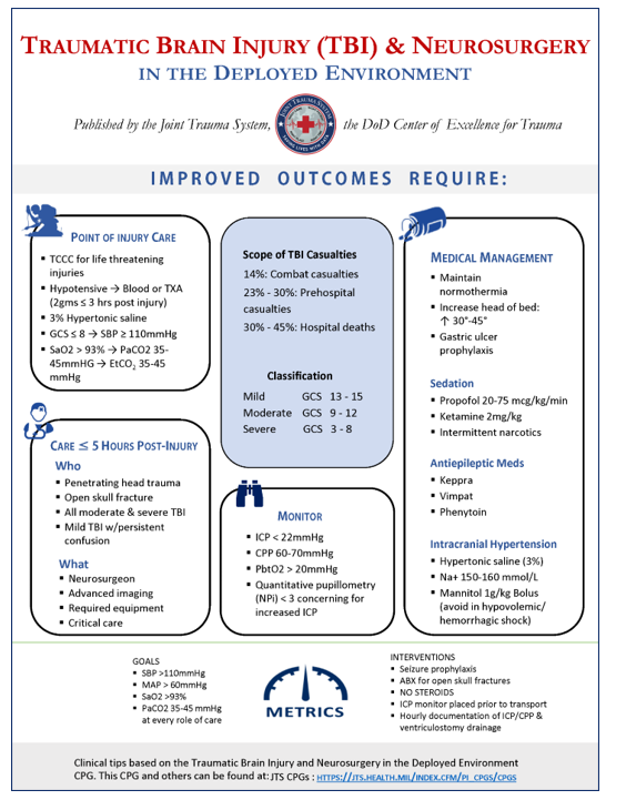 Traumatic brain injury (TBI) occurs in about one third of all trauma-related deaths in the United States and remains one of the most common causes of death on the modern battlefield.1,2 The Committee on Surgical Combat Casualty Care (CoSCCC) published a Neurosurgical Capabilities Position Statement in Feb 2023 given the importance of this issue. Specific to the combat environment: