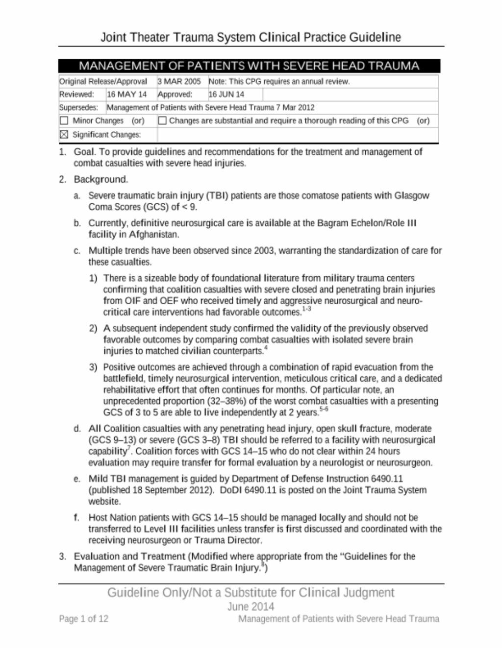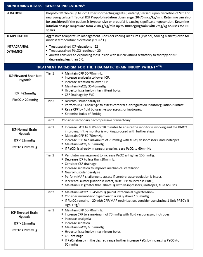 Management of severe TBI patients using information from ICP monitoring is recommended. Although long-term outcomes have not been shown to be improved with ICP monitoring, there is evidence that in-hospital and two-week post-injury mortality is improved.22 Additionally, the military trauma system may require multiple patient movements and handoffs that decrease the ability to follow neurologic exams. Therefore, ICP monitoring may detect a deterioration that would normally be detected on serial neurologic exam in a stable ICU environment.