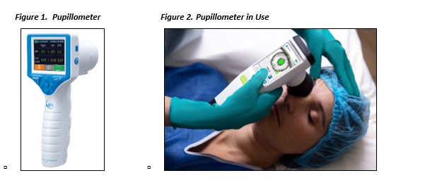 Beyond pupil size and reactivity, multiple metrics (pupil minimum / maximum size, percentage change of pupil, latency, constriction velocity, maximum constriction velocity, dilatation velocity) can be gathered and compared to normative standards. A commonly employed device is the NPi-200 Pupillometer, manufactured by NeuroOptics (Laguna Hills, CA). This device, in addition to gathering the above data, compares the gathered data to established normal values to create a Neurologic Pupillary Index (NPi) score which ranges from 0-5. NPi values < 3.0 reflect an abnormal PLR5. The presence of a decreased constriction velocity (CV < 0.8 mm/s) is also strongly correlated (but independent) to an abnormal NPi as well as independently associated with elevated intracranial pressure11. Developing an understanding of NPi and CV may provide early insight to neurologic deterioration12.