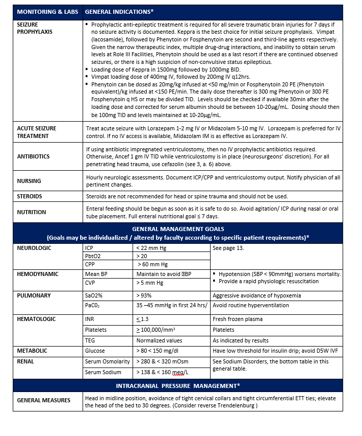 The initial management of the patient with brain trauma begins with addressing life-threatening injuries and resuscitation in accordance with Tactical Combat Casualty Care (TCCC) guidelines in the field for corpsmen and combat medics or Advanced Trauma Life Support (ATLS) providers.18