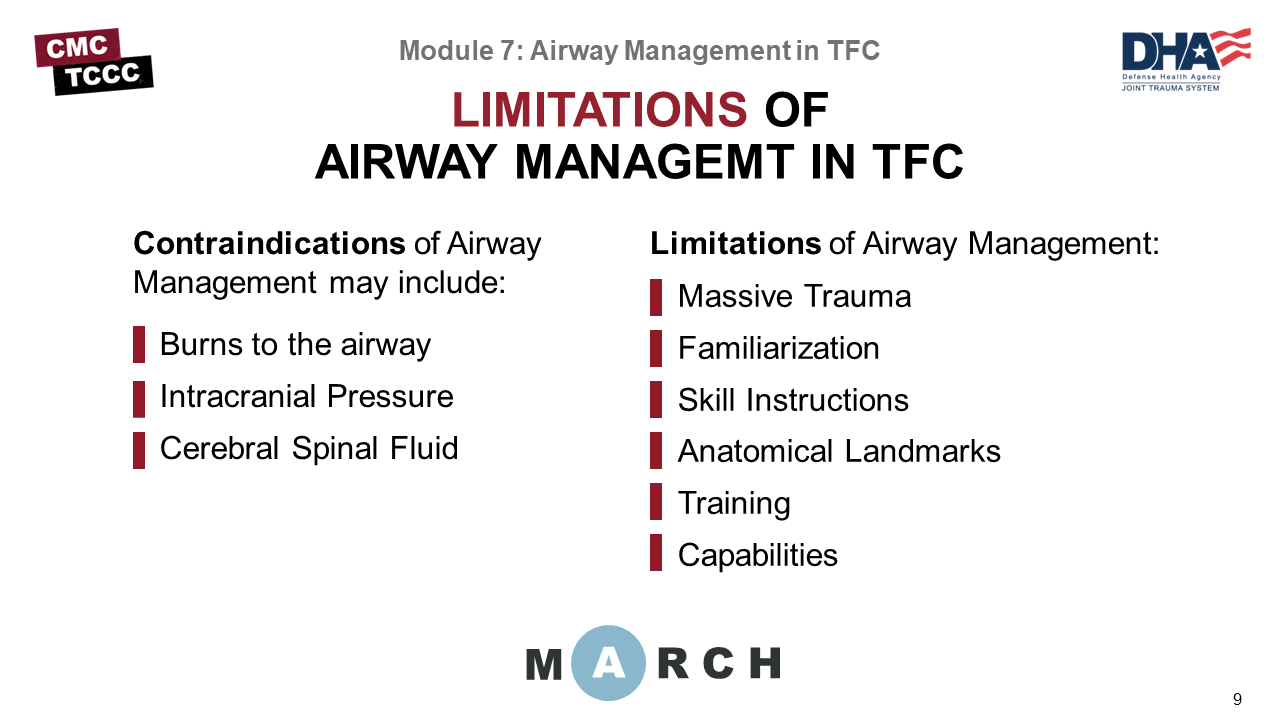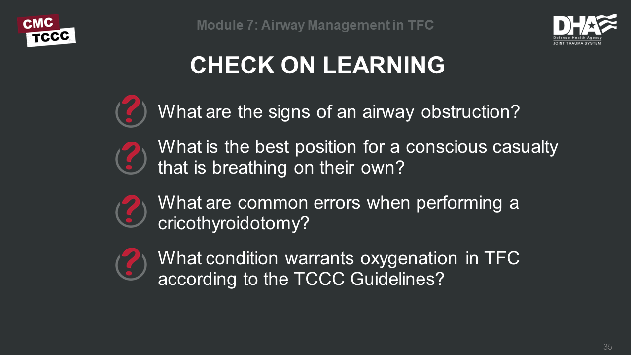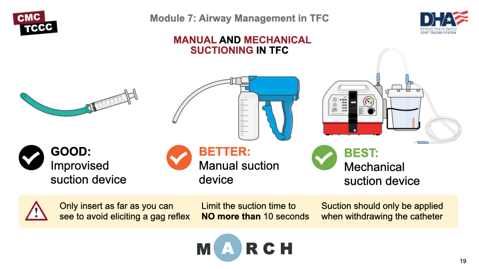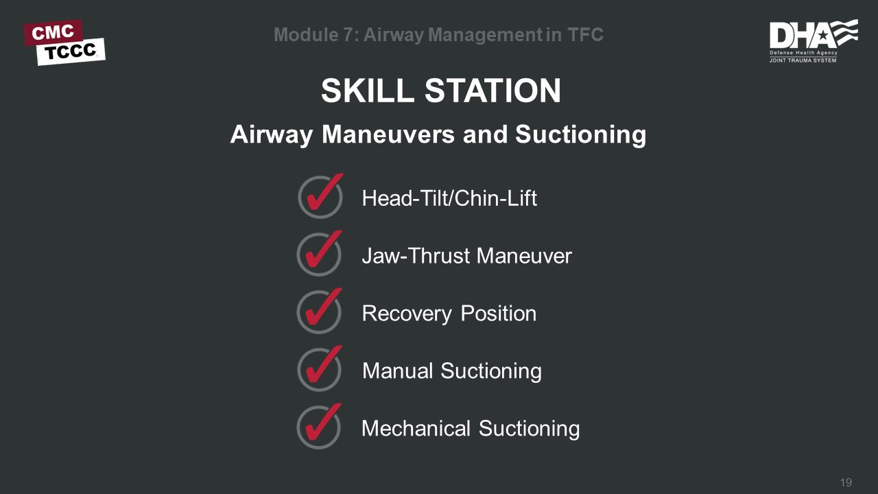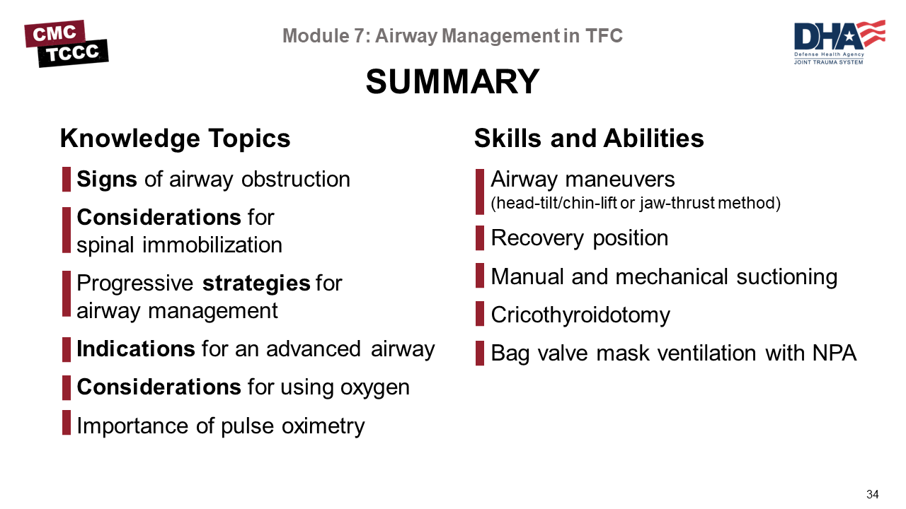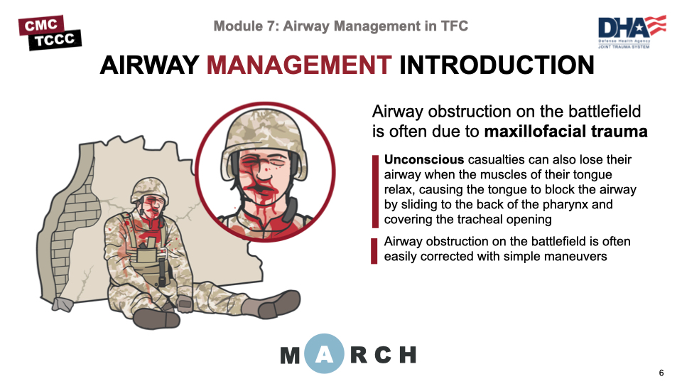 Together, the knowledge and skills learned from this module will prepare you to manage airways in the Tactical Field Care environment.