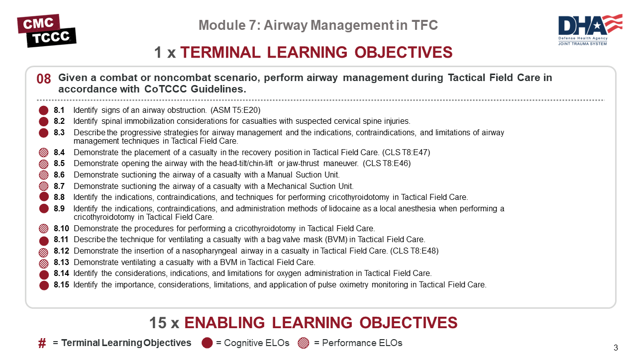 The performance learning objectives are opening the airway using a head-tilt/chin-lift or jaw-thrust method, manual and mechanical suctioning, establishing an airway by cricothyroidotomy, placing the casualty in the recovery position and ventilating using a bag valve mask and a nasopharyngeal airway (NPA).