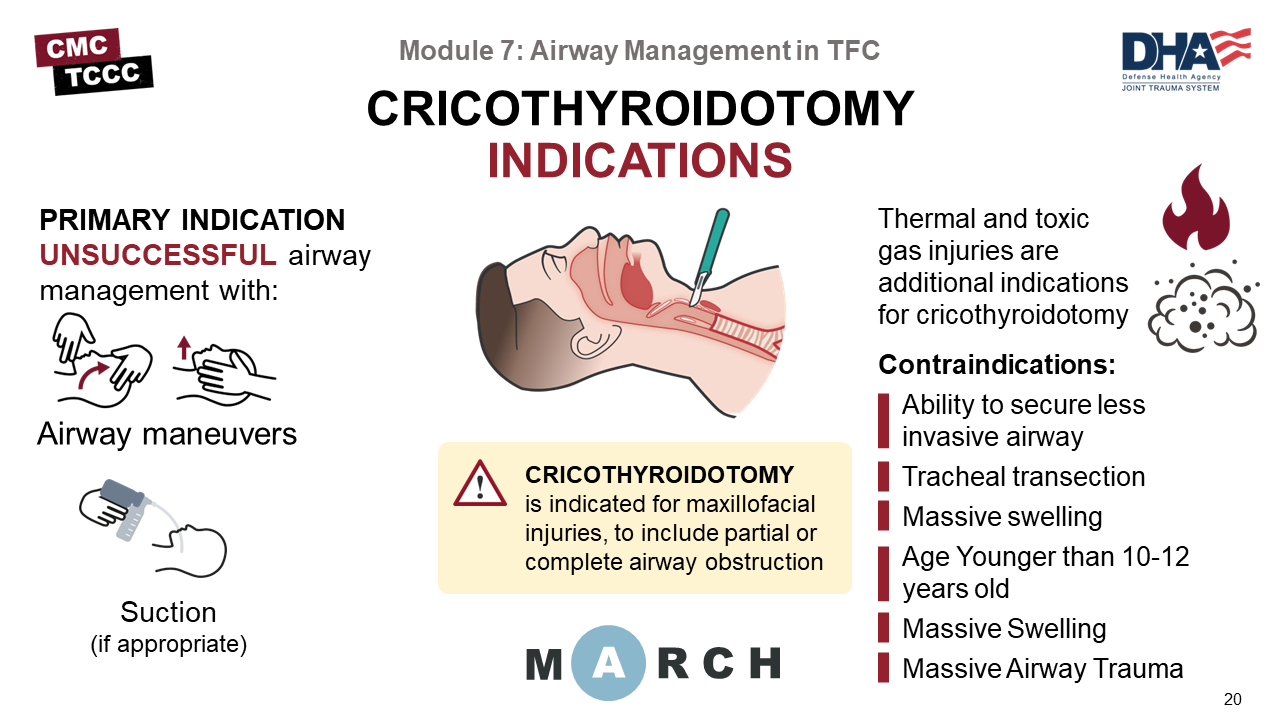 The primary indication for performing a cricothyroidotomy has already been mentioned – an unsuccessful attempt to maintain a patent airway using positioning techniques often in casualties with facial and oral trauma.