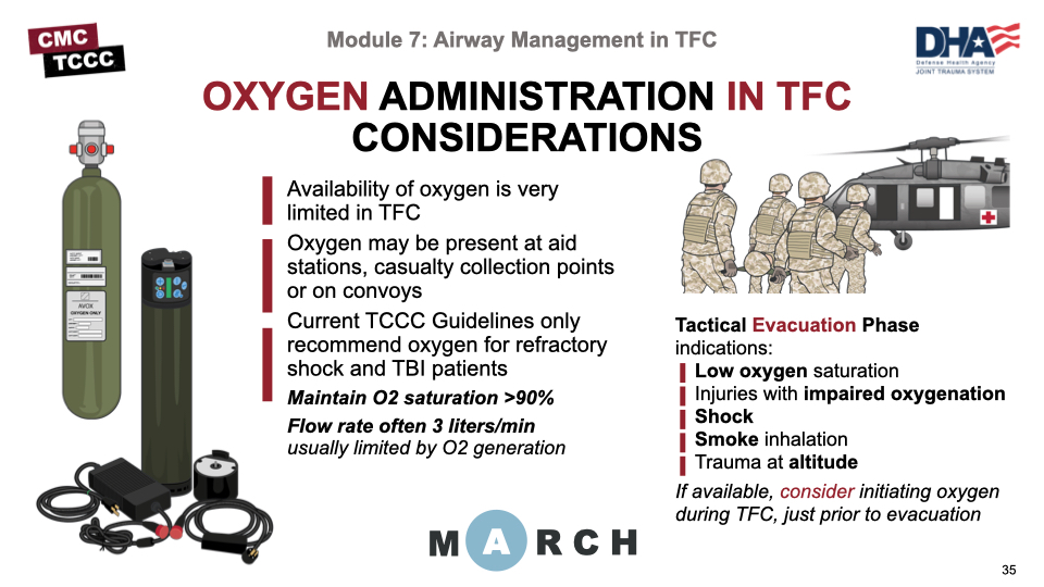 Although combat medics seldom carry oxygen with them due to its weight and potential injuries from the pressurized containers, advances in oxygen generation are moving smaller, safer oxygen resources closer to the battlefield, and oxygen may be found at casualty collection points (CCPs) or with some convoys. Current TCCC Guidelines recommended oxygen use, if available, in patients with signs of refractory shock or TBI patients, with the goal of maintaining an oxygen saturation greater than 90%.