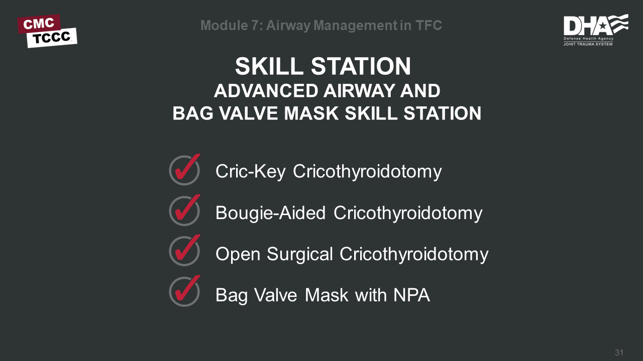 During this module, we will discuss airway management in the Tactical Field Care setting, which involves the process of assessing for potential airway compromise and making decisions regarding which airway maneuvers or interventions will provide the best outcome for a combat casualty. In addition to the didactic presentation and discussion of airway management principles, there are several skills stations where you will have an opportunity to get hands-on practice on the procedures you need to master.