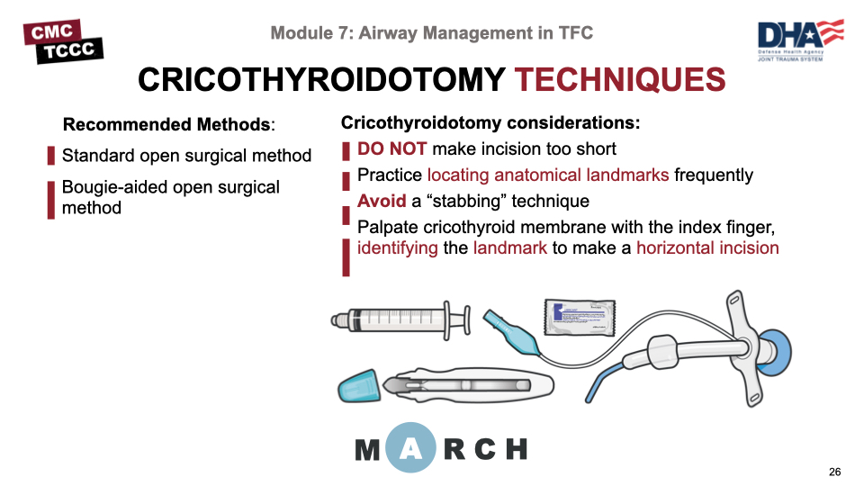 There are several methods for performing a cricothyroidotomy, and CoTCCC research has helped identify which techniques have evidence to support their recommendation for use. Of note, a crossover study comparing the Cric-Key™ with the standard surgical procedure revealed that medics perform the procedure faster and with a lower failure rate using the Cric-Key. For that reason, it is considered the preferred device for cricothyroidotomies. The other two techniques that are CoTCCC-recommended include the bougie-aided open surgical technique and the standard open surgical technique.