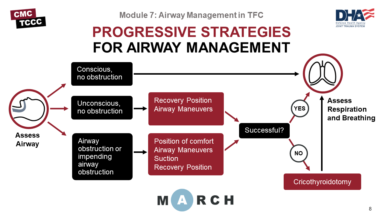 The TCCC Guidelines outline the Committee on Tactical Combat Casualty Care (CoTCCC)-recommended approach to airway management. We will review the details of each step and intervention throughout the rest of this module and in the skills stations, but this provides a general overview of the strategy you should adopt in assessing and managing the airway during Tactical Field Care.