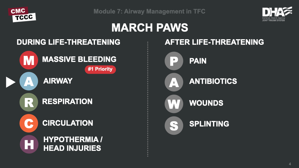 Airway management is the “A” in the MARCH PAWS sequence. In a review of preventable deaths in Afghanistan and Iraq, it was determined 1.8% of the fatalities with potentially survivable injuries died from airway obstruction.