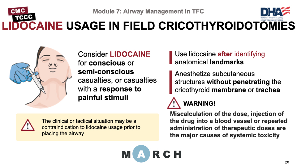 Not all casualties who need a cricothyroidotomy will be unconscious and unresponsive to painful stimuli. If your casualty is conscious, semi-conscious, or has exhibited responses to painful stimuli during the first part of your assessment, and a surgical airway is indicated, consideration should be given to using lidocaine to anesthetize the skin and neck structures prior to the procedure. However, the clinical or tactical situation may be a contraindication to anesthetizing the casualty prior to placing the airway. For example, a complete or near-complete obstruction with impending respiratory arrest should be addressed immediately, even if the casualty is conscious. Likewise, there may be tactical situations that require an immediate response due to time constraints in maintaining a safe environment for you and your casualty. Lidocaine is not always available, as some unit procedures and packing lists do not prioritize lidocaine for the medical aid bag.