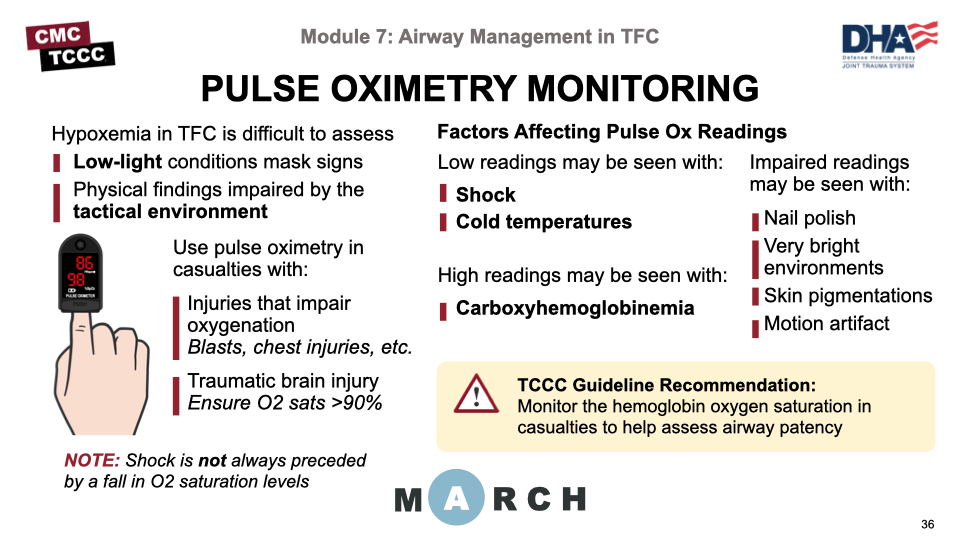 Pulse ox monitoring should be initiated in casualties who are unconscious or who have injuries associated with impaired oxygenation (like blast injuries, chest contusion, and penetrating injuries of the chest). It should also be used to monitor casualties who have TBI, in order to ensure that their oxygen saturations remain above 90%, as hypoxemia will worsen their clinical outcomes.