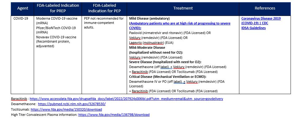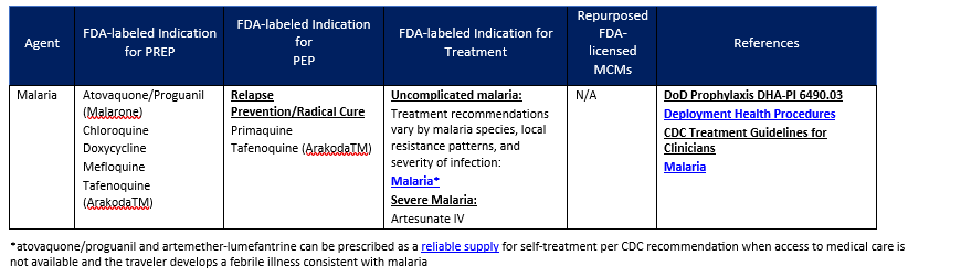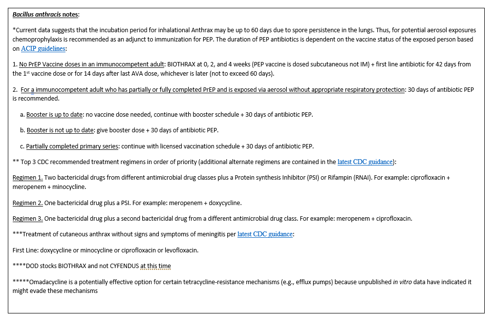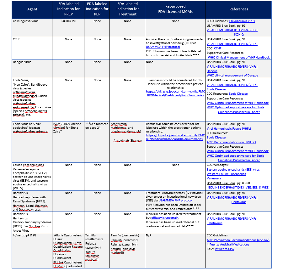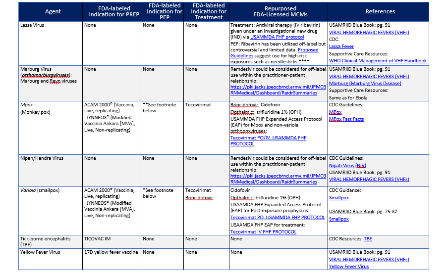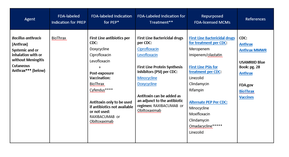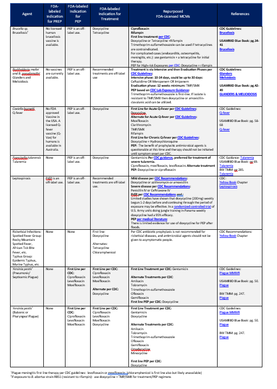 These tables are designed to provide a snapshot of the pre-exposure prophylaxis (PrEP), post-exposure prophylaxis (PEP) and treatment MCMs available for select biothreats. This appendix will be updated as rapidly as possible as new threats emerge, or as new information on MCMs are developed. For additional information on vaccines, DHA maintains a website that displays vaccination recommendations by CCMD (https://www.health.mil/Military-Health-Topics/Health-Readiness/Immunization-Healthcare/Vaccine-Recommendations/Vaccine-Recommendations-by-AOR). There are nuances to utilization of many of these MCMs, so utilize the hyperlinks for references given by agent for dosing and duration. Given that FDA labels are periodically updated or generic manufacturers change, so hyperlinks to labels are not included by MCM. Either DAILYMED (https://dailymed.nlm.nih.gov/dailymed/index.cfm) or Drugs@FDA (https://www.accessdata.fda.gov/scripts/cder/daf/index.cfm ) can be utilized to find the most up-to-date product labels. DAILYMED has more user-friendly search features but note that the "in use" labeling on DailyMed may not be identical to the most recent FDA-approved labeling available at Drugs@FDA, or the labeling distributed with products. This appendix also links to additional information on potential uses of repurposed MCMs within the practitioner-patient relationship (CAC enabled website: https://pki.jacks.jpeocbrnd.army.mil/JPMCBRNMedical/Dashboard/RaidrSummaries). Finally, the U.S. Army Medical Materiel Development Activity (USAMMDA) provides a number of Force Health Protection (FHP) protocols and are noted in the tables below if available.