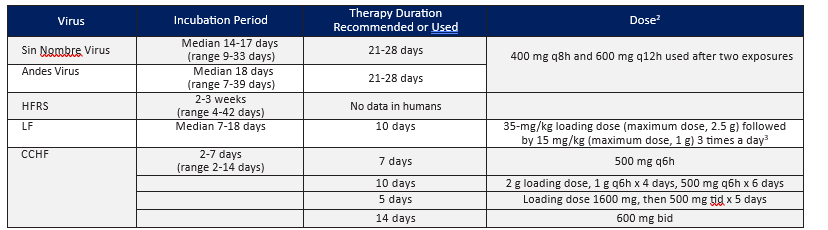**** Dosage Regimens of Oral Ribavirin Recommended or Used for Post-exposure Prophylaxis Following Exposure to Hantaviruses, Lassa fever (LF), and CCHF Viruses in Adults1