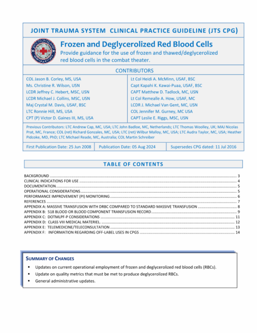 DRBCs may be used in lieu of liquid-stored RBCs for all RBC transfusion requirements including massive transfusions. The Joint Trauma System (JTS) Performance Improvement Branch analyzed data from the DoD Trauma Registry (DoDTR) and Massive Transfusion database and found no statistically significant difference in outcomes or transfusion-related complications between patients who received at least 1 unit of DRBCs as part of their massive transfusion and those who received only liquid-stored RBCs (See Appendix A). A single center prospective randomized trial comparing DRBCs to liquid-stored RBCs in stable trauma patients revealed decreased cytokines and D-dimer levels and increased tissue oxygenation measured by near infrared spectroscopy in patients transfused DRBCs. There were no differences in clinical outcomes. 2,4